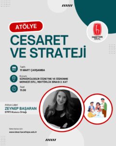 STRTJ kurucu ortağı Zeynep BAŞARAN ‘ın liderliğinde gerçekleşecek olan ‘Cesaret ve Strateji’ atölyemize girişimci adaylarımızı bekliyoruz.